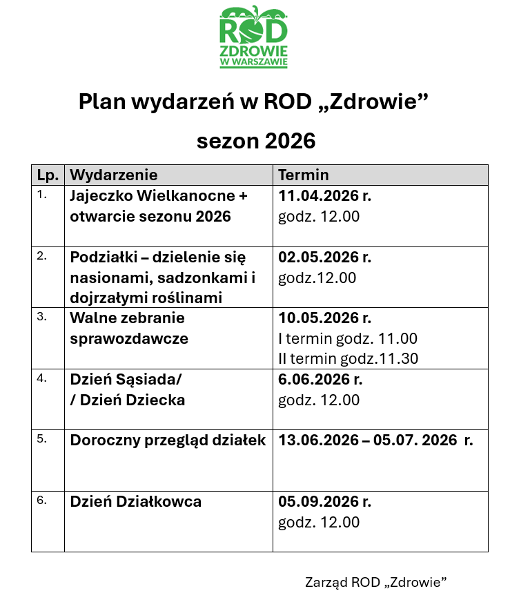 Zarząd ROD „Zdrowie” serdecznie zaprasza wszystkich Działkowców na obchody Dnia Działkowca 20 września 2025 (sobota)